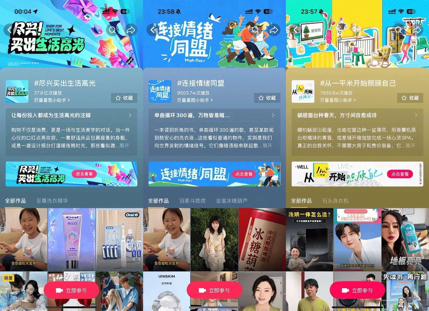 而在线上,抖音围绕618消费的实用主义和情绪价值,推出618抖音精选种草季,每条清单都是年轻人关注的购物趋势热点。主会场话题#TA的精选你的清单,种草用户生活清单和好物清单,而时尚、变美、居家、户外四大分会场,则在各个细分品类引领618消费潮流风向标,活动共实现了15亿的活动总曝光。