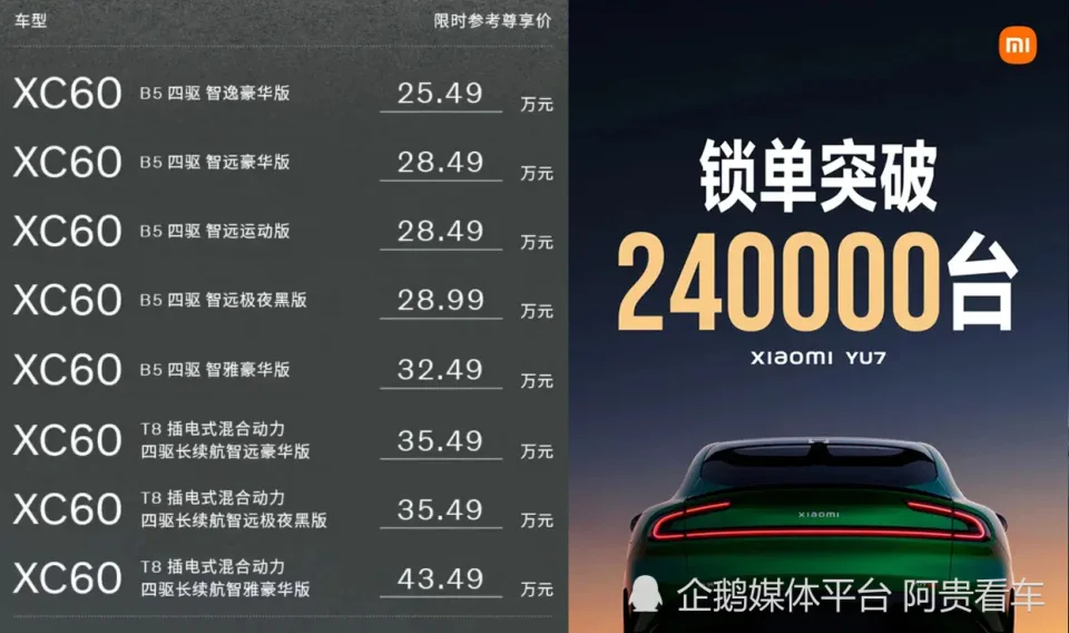 2025年6月26日这一天,小米YU7和沃尔沃全新XC60同期上市,这一正常现象却引起网友们的吐槽:“沃尔沃居然敢硬刚小米”。而上市成交价格也成功撞车:小米YU7为25.35万元起,全新XC60一口价25.49万元起,前者锁单超24万,后者上市就官降14万引起全网议论。