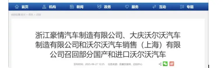 更为尴尬的是,沃尔沃引以为傲的安全却不断的引起质疑,5月13日沃尔沃因为倒车影像故障召回在美售出的40多万辆车,6月25美国因为“软件故障或导致车辆失去制动力”召回1.4万辆沃尔沃插混车型,到了6月27日又因为这个问题召回在中国售出的5600多辆沃尔沃车型,其中2024年4月8日至2025年6月11日生产的插混XC60召回3378辆。