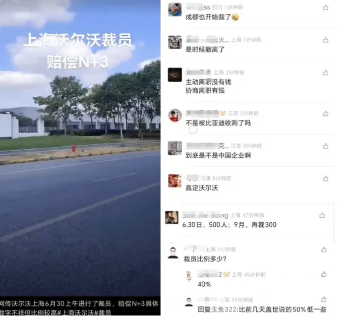 而中国作为沃尔沃第一季度销量下滑最严重的区域,出现裁员似乎也很正常,所以在日前,沃尔沃中国裁员的消息也接连曝出。其中最值得一提的是6月30日一位网友发布的视频称:上海嘉定沃尔沃工厂开始裁员,赔偿N+3。该视频下还有网友继续曝料称嘉定工厂6月30日裁员500人,9月份再裁300人,比例在40%左右。除此之外,还有网友称成都工厂也开始裁员……