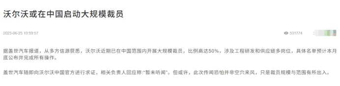 虽说这是“流量为王”时代环境下,汽车饭圈文化兴起而带来的黑色幽默,但沃尔沃产品跟不上节奏、销量不理想、关注度下降、全球裁员也是事实。而且在近期,沃尔沃还数次传出在中国地区裁员的信息,因此越来越多人担忧,这个总将“安全”挂在嘴边的经典豪门,离安全越来越远。