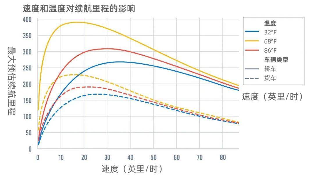 外部温度和空调使用仍然是影响续航里程的主要因素。据《福布斯》报道,2019 年,美国汽车工程师协会的测试发现,当温度达到95°F(35°C)时,电动汽车的平均续航里程会比75°F(24°C)时减少 17%。然而,高温的影响在较低速度下更为明显,因为此时空气阻力会减小。