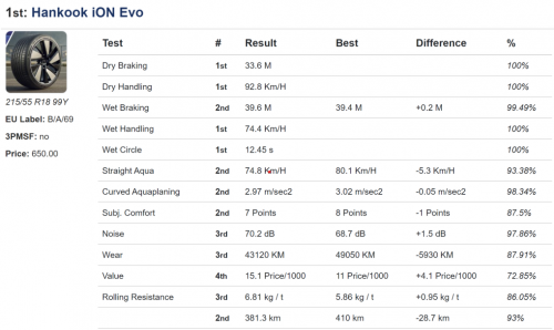 权威媒体的横评是轮胎性能更直观的体现。今年春天,外媒《Auto Bild》曾对市场上8款火爆的电动轮胎进行评测,评测规格为215/55 R18。在12项测试中,韩泰iON evo获得4项第一、4项第二的成绩,综合成绩一举夺魁。其中干地制动、干地操控、湿地操控、湿地圈速四项关键性能第一。