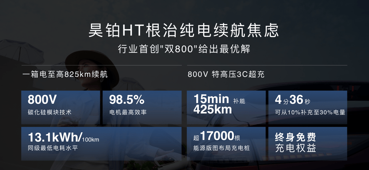 广汽昊铂HT基于特有的“双800技术”打造,在800V特高压3C快充的支持下,15分钟内便可以补能达到425km,长续航版本的CLTC续航里程达到825km,在国内不少城市都可以实现满电出发跨省自驾游期间不用补能。
