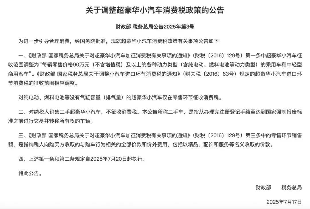 7月17日,财政部、国家税务总局公告,7月20日起超豪华小汽车消费税征收范围调整将从每辆零售价格从130万调整到90万元,并将于7月20日起正式执行。