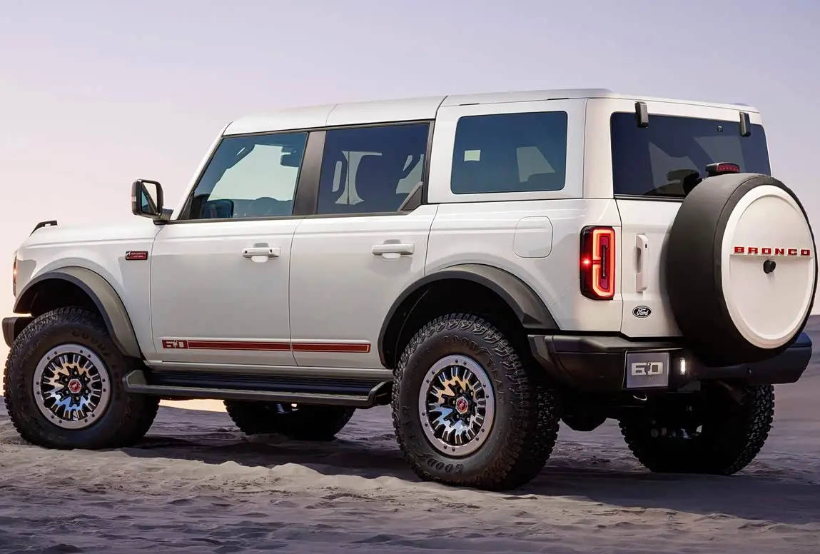 外观上,新车以复古设计致敬初代车型:中网格栅采用暖合金涂装,灵感源自1966年款,搭配朱红色"BRONCO"字母标识;专属17英寸重力灰轮圈复刻了初代车型的轮毂风格,中心盖印有朱红色奔马LOGO及"1966"字样,搭配35英寸固特异地形胎。车身提供温布尔登白(配同色车顶)和宝石红(配白色车顶)两种专属配色,侧门、翼子板处点缀"60"周年徽章及奔马标识,尾部外挂备胎罩同样采用白色涂装并呼应车头字母设计。