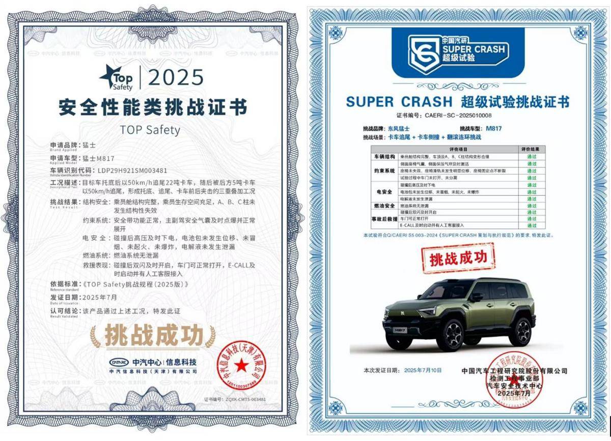 猛士M817将“军工基因”转化为民用安全标杆。其战甲车身采用12.48米超长2000MPa热成型钢骨架,83.2%高强钢占比构筑环抱式座舱。最震撼的是车门结构:1500MPa一体式热成型门环+2000MPa防撞板+9孔加强梁,形成类似坦克舱门的复合防护层——这在侧面碰撞测试中,能降低40%乘员受伤风险。
