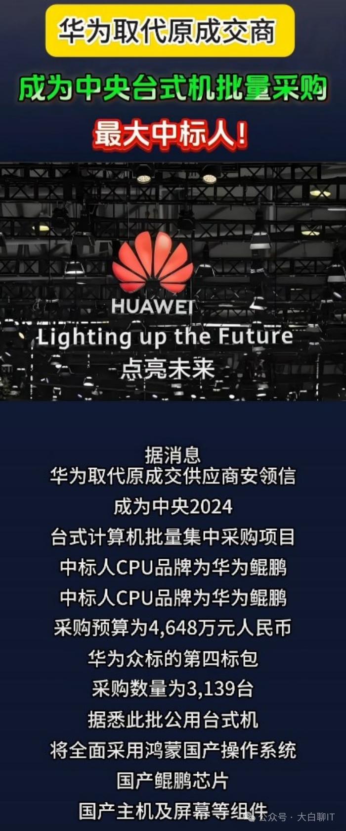 此次中标是华为在台式计算机领域的一次重要突破,可以看出华为在信息技术应用创新(信创)领域的深厚布局和强大实力,有助于华为在台式机市场扩大份额,提升其在国内政府采购市场的影响力,同时也为其未来在相关领域的发展奠定了更坚实的基础。