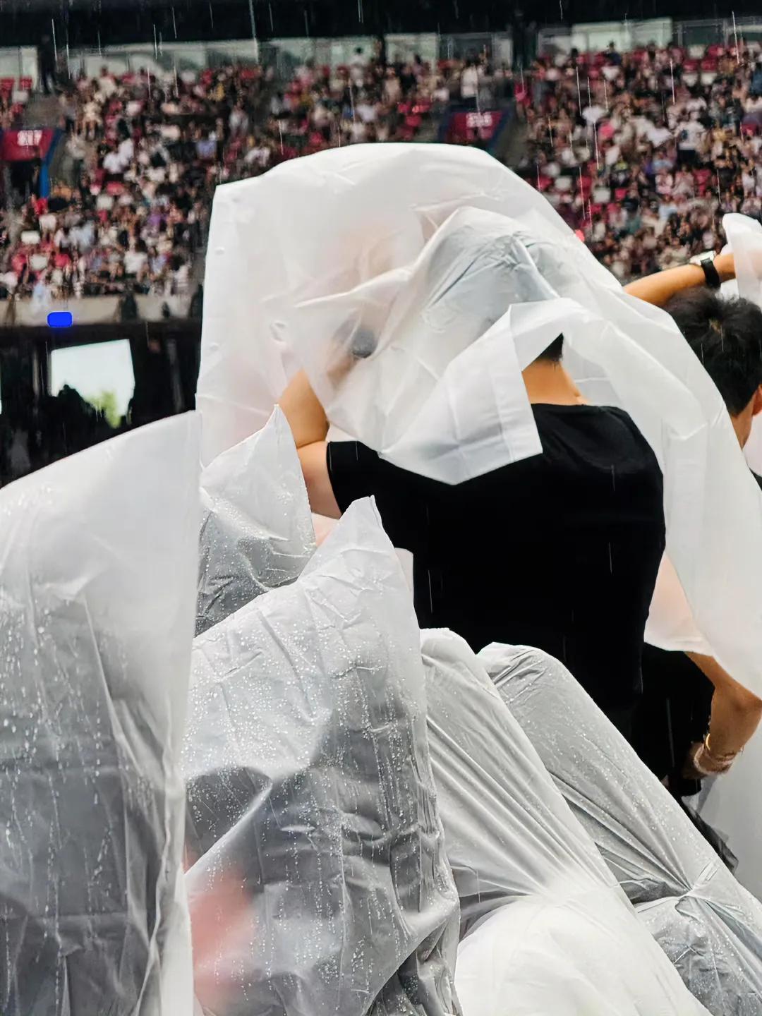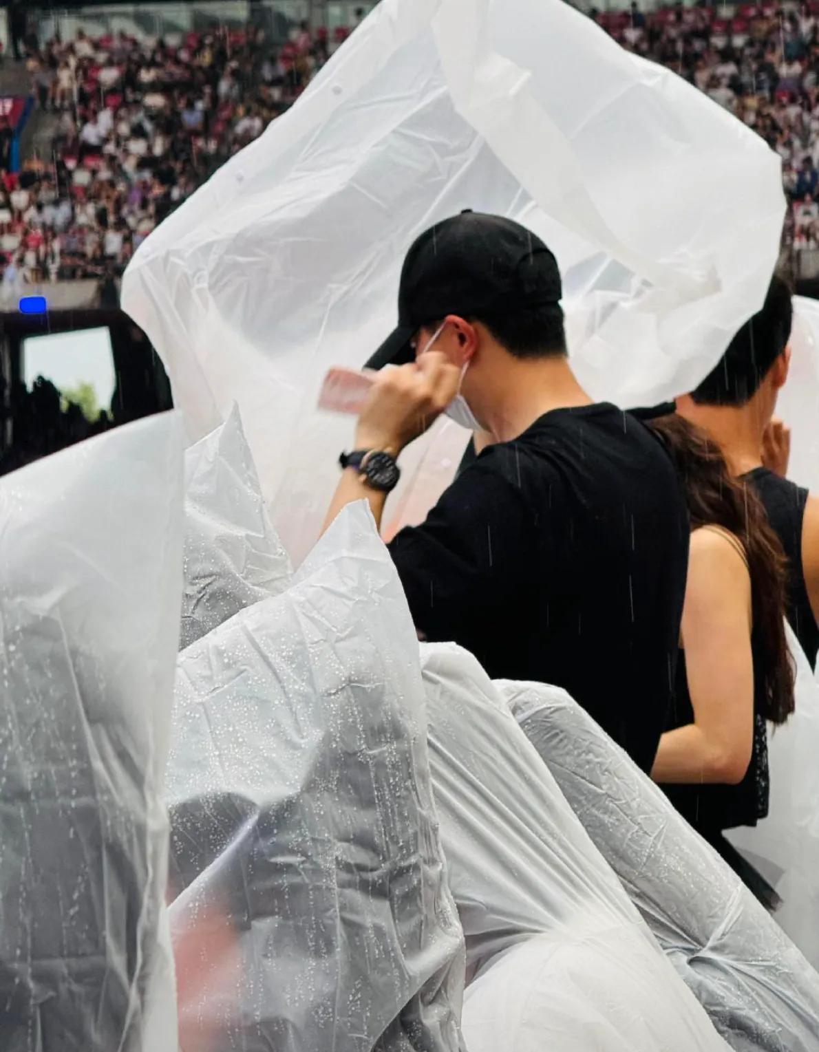 当晚北京下雨,马龙穿着主办方提供的雨衣观演。