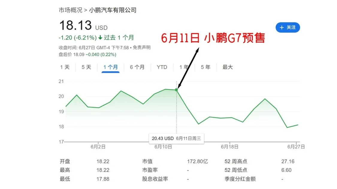 而更多的车型,可能沦为炮灰的角色,比如不被市场所特别看好的小鹏G7。其预售是一个关键的分水岭,在预售前,股价顺风顺水的上涨,而在预售之后,股价是闪崩式的下跌。资本市场对其的态度,也与消费者对其的认定,保持了一致。