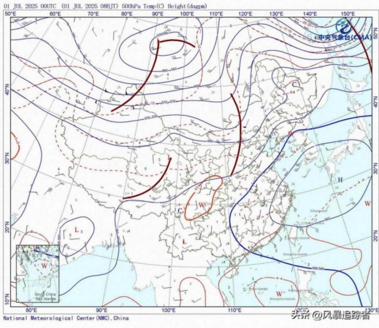 7月开始,天气形势再次大转变,高温暴雨台风又要齐来了。为什么这么说?因为500百帕的实况天气图上,副高又大幅度西伸和北抬了。注意“大幅度”这个说法,根据代表副高的588百帕位势线看,西侧已抵达湖南西部、广西北部,北侧抵达湖北中部、苏皖北部、山东东部一带。副高西伸和北抬这么远,有什么影响呢?第一,副高内部受下沉气流控制,高温范围广、强度大;第二,副高西侧和北侧边缘,成为新一轮强降雨区;第三,引导台风路径偏西,靠近我国概率大。