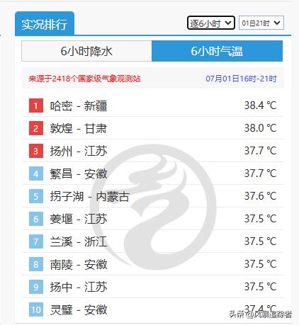 先说高温,这几天除新疆外,东南沿海的高温已经启动了,比如7月1日晚间时,全国逐6小时气温榜上,苏皖浙江一带已经霸榜了,全国高温排行榜中,前10位占据了7位之多。7月2日起,中东部高温再次加强,37-40℃的区域将大面积出现,苏皖北部更热,4日左右有大范围40℃以上的高温区,面积之大或创新纪录。作为省会城市的杭州,官方预报中显示,7月5-6日这两天的最高温也将达到40℃或以上。这样一来,它可能打破当地最早升温到40℃的纪录。
