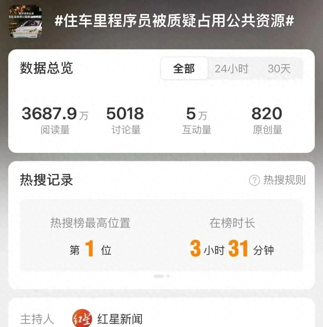 今年四月有媒体报道深圳程序员张运来,他在深圳住了四年没租房,天天晚上睡在电动车里。他说自己白天上班晚上停在停车场,偶尔去公园厕所刷牙洗脸。这事上微博热搜后,有人觉得他占了公共资源,但他解释说晚上车位空着多得很,自己也没搞破坏。