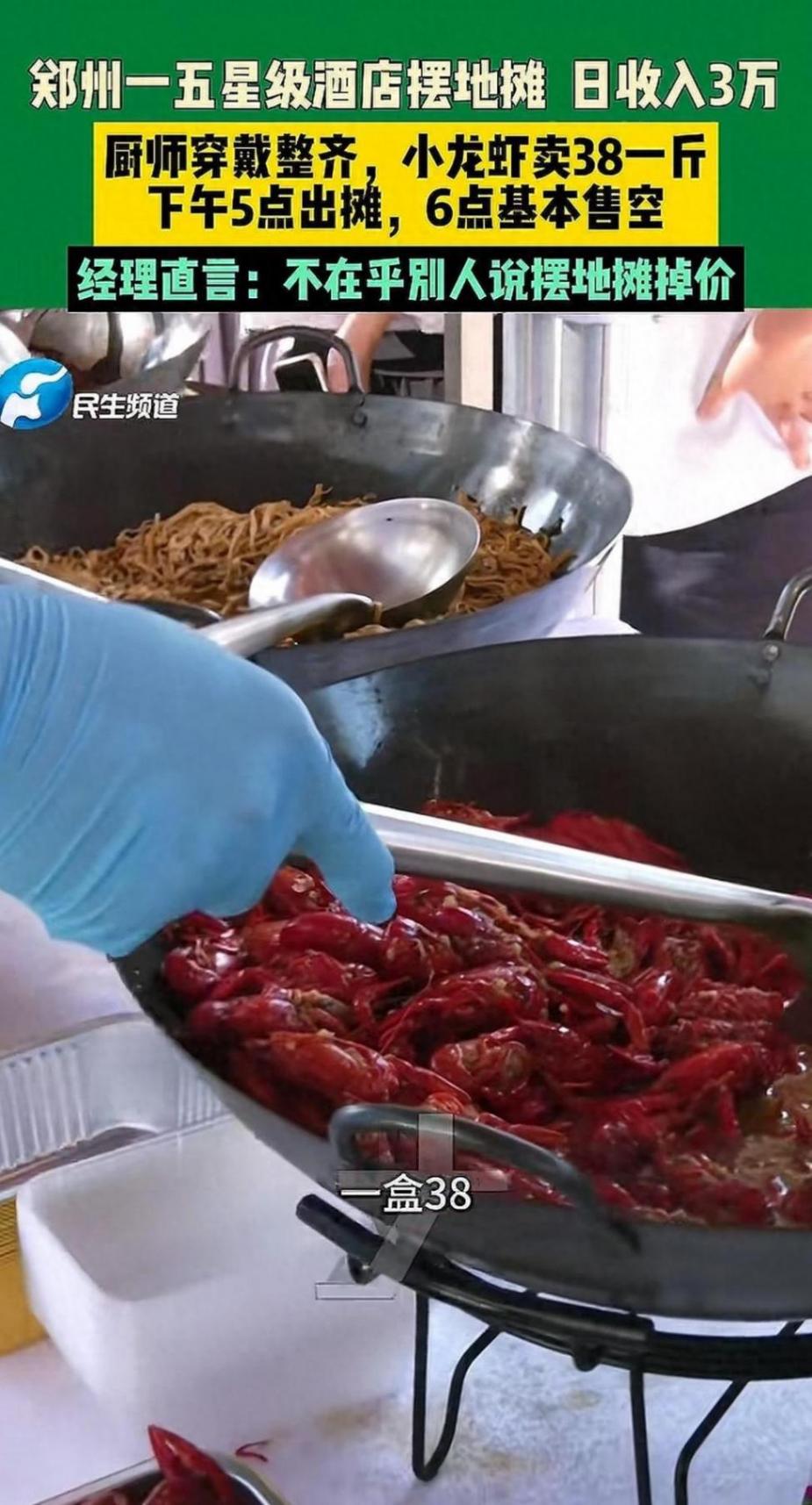 近日,郑州一五星级酒店摆地摊一天收入3万的消息引发热议。据报道,该五星级酒店厨师穿戴整齐,下午5点在酒店门口出摊,小龙虾卖38元一斤,6点基本售空。酒店负责人表示,一天收入3万元左右,不在乎别人说摆地摊掉价。在武汉,这几天也有一家豪华酒店外摆摊位卖早餐、午餐、晚餐,种类丰富,价格可与快餐门店比拼。