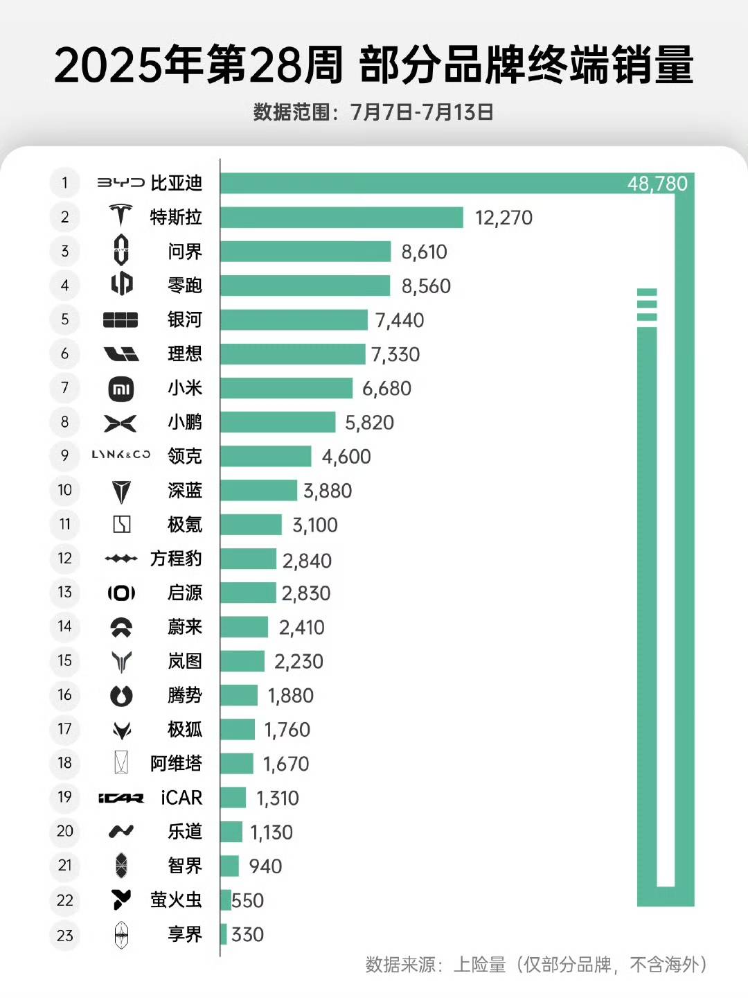 具体来看,作为新能源市场无可撼动的销量冠军,比亚迪上周销量不足5万台,48780辆的销量成绩,几乎已经来到了近两个月周销量成绩的最低点。位列比亚迪之后的是特斯拉,作为上周为数不多实现环比正增长的品牌,特斯拉上周销量为12270辆,相比于从6月底到7月初的过渡周,上周销量实现了翻倍增长,排名也随之回归前二。