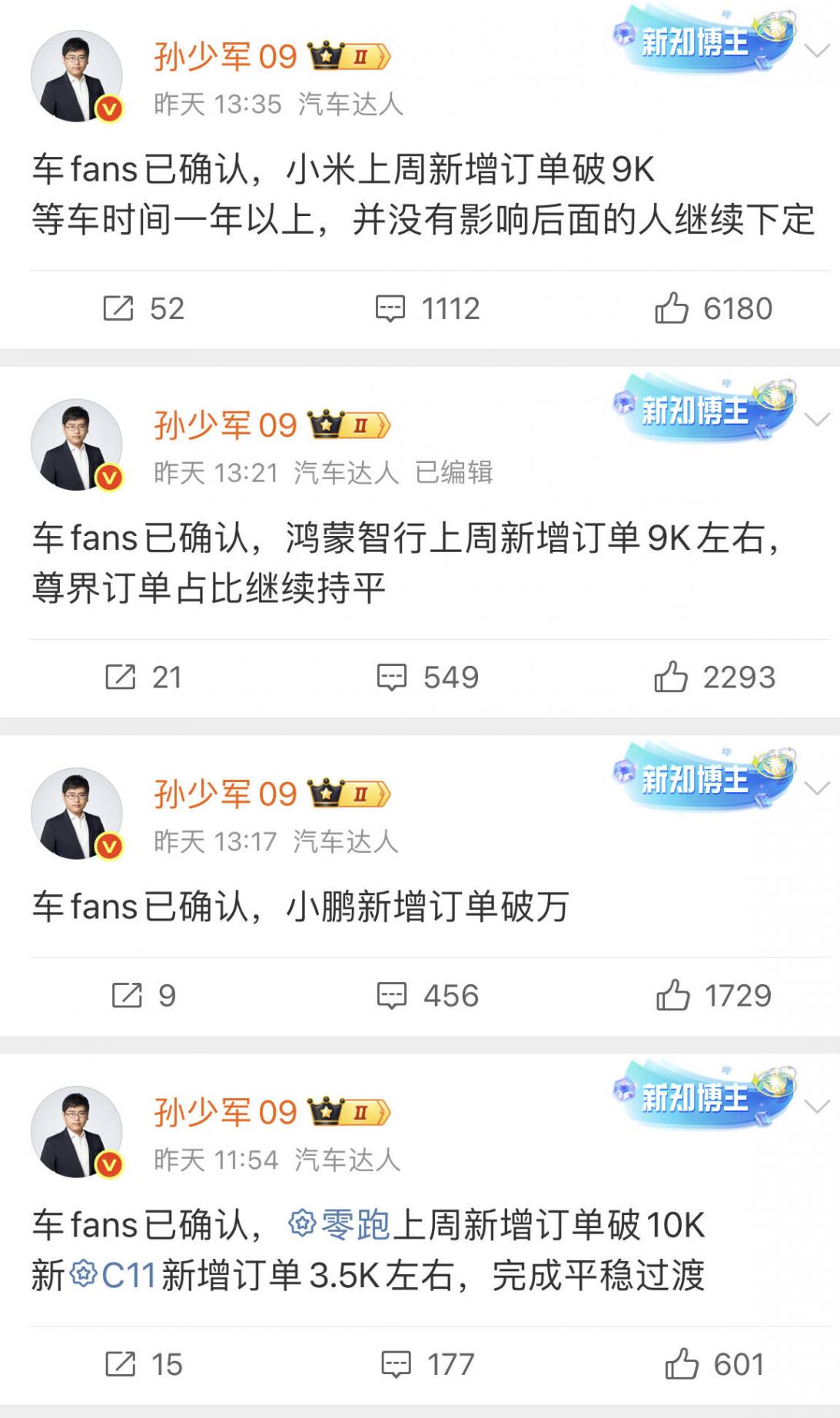 7月10日,作为的销量主力,零跑全新C11已经迎来上市。在新车的刺激下,零跑上周新增订单突破1万台,其中全新C11新增订单约3500台,这一订单表现已经超过鸿蒙智行四个“界”的新增订单总和。根据汽车媒体车fans创始人孙少军公布的数据显示,上周鸿蒙智行新增订单约9000台左右。