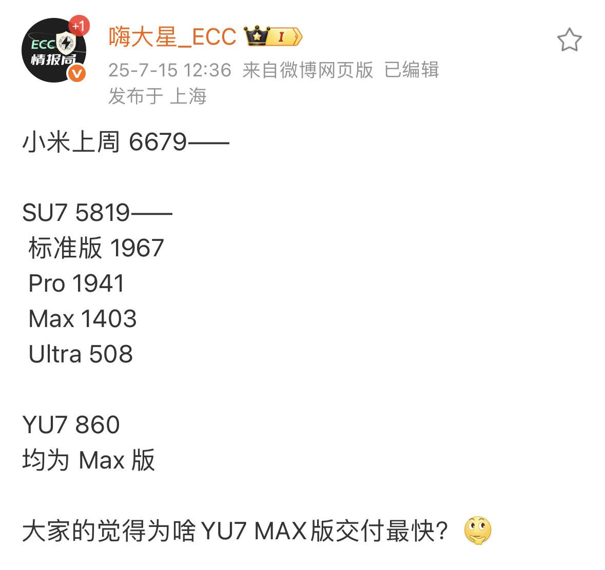 根据部分汽车博主统计的数据,在小米汽车第二周的交付中,SU7仍然是交付主力,上周交付5819辆,而YU7交付量占比较小,为860辆,且均为Max版本。