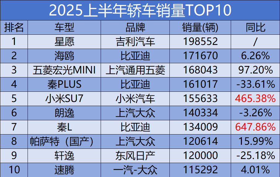 上半年轿车销量TOP10:吉利星愿夺得销冠,秦L涨超6倍排第7?