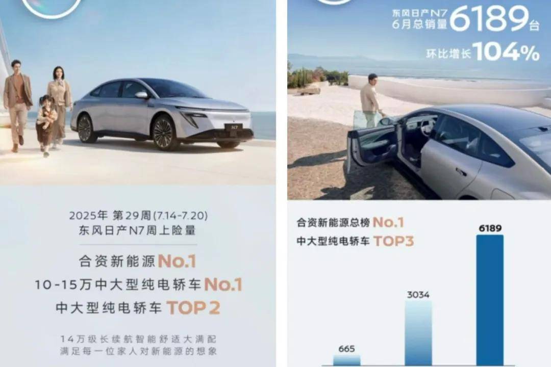 东风日产N7上市50天累计大定超2万辆,6月销量 6189 台,环比增长 104%,位列合资新能源销量总榜TOP1,中大型纯电轿车市场 TOP3。就在7月,N7连续多周获得10-15万中大型纯电轿车冠军,销量增长,气势蓬勃。
