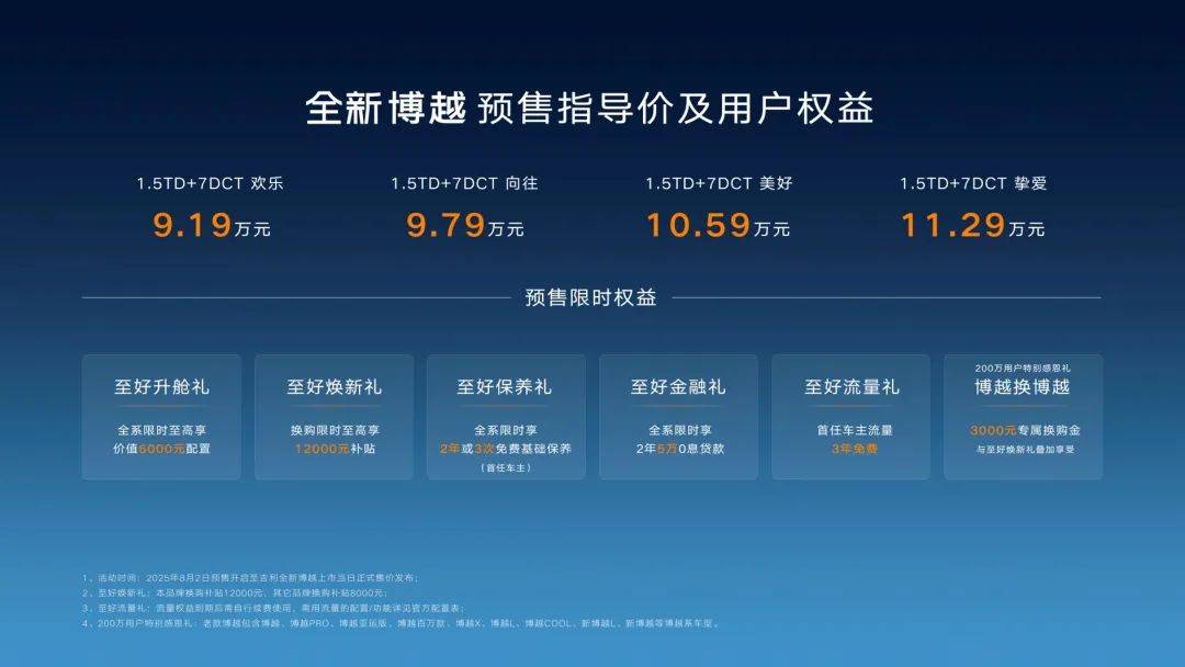 近日,全新博越发布了预售价,9.19-11.29万元。同时,也有一些预售权益,包括升舱礼、金融礼、焕新礼、流量礼、保养礼等。特别是对博越老车主,还有一份专属感恩礼。