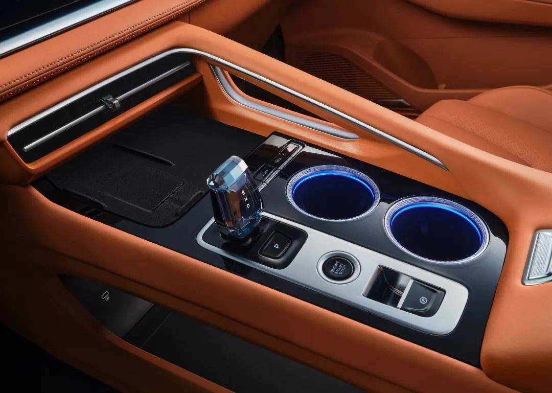 值得注意的是,挡把做了水晶切割处理,晶莹剔透;音响氛围灯有12个发光区域,并且支持256色光影流转,氛围感十足。