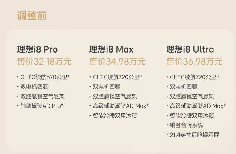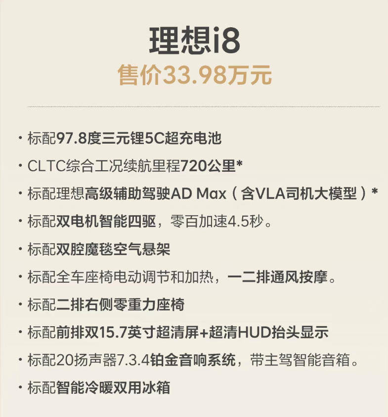 首先是i8车型调整后的配置变动问题,理想宣称有超过98%的用户选择了理想i8 的Max和Ultra车型,它们看到消费者偏爱高端就决定决定统一配置版本,既然官方这么说大家也就这么信了吧。原先的理想i8 Max作为标准配置后,指导价从34.98万降低为33.98万。此外之前顶配车型才有的价值1万元的铂金音响送了,然后还可花1万元选装后舱娱乐屏套装。所以严格意义上来说,理想i8不是在MAX版本降价升级,而是直接把顶配的Ultra车型砍掉一个标配当标准版卖了。