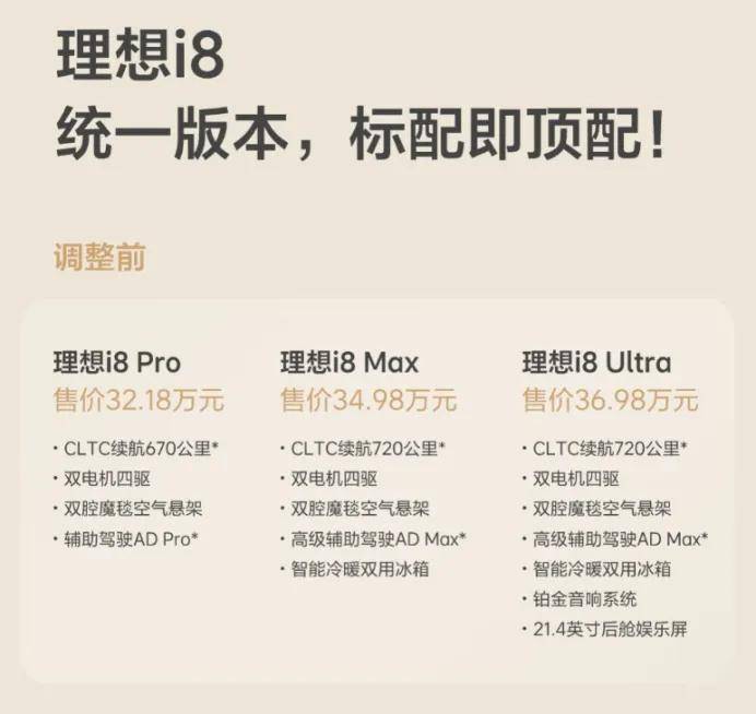 这几项叠加之后,表面上看似是三款配置缩成了一款,实际是理想用一款配置满足了三个档次的需求。显然,这次“听劝版”的推出,带来了两个最直接的影响:比起以前流行的高中低配置划分,理想i8进一步适应了这个“怕麻烦”、追求一步到位的时代,统一的配置减少了用户的选择成本和销售的解释成本;同时,增配降价的举动,也让人进一步感受到了理想i8的诚意。